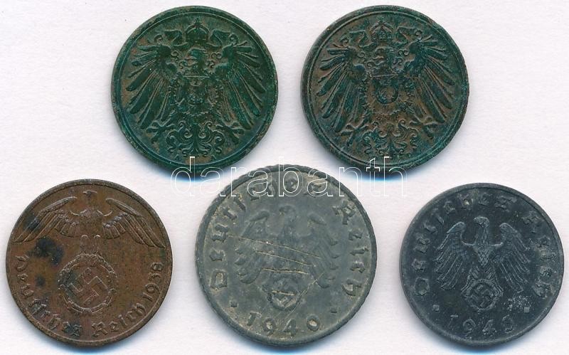 Német Birodalom 1908-1914. 1pf (2xklf) + Német Harmadik Birodalom 1938-1943. 1pf (2xklf) + 1940. 5pf T:2,2-