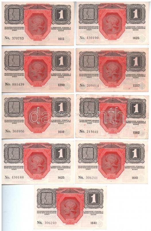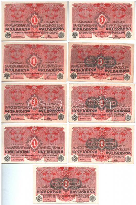 Leírás: 1916. 1K (9x) négy db-on "DEUTSCHÖSTERREICH" felülbélyegzéssel, közte 1 pár sorszámkövető, 1 pár közeli sorszámú T:I-I-