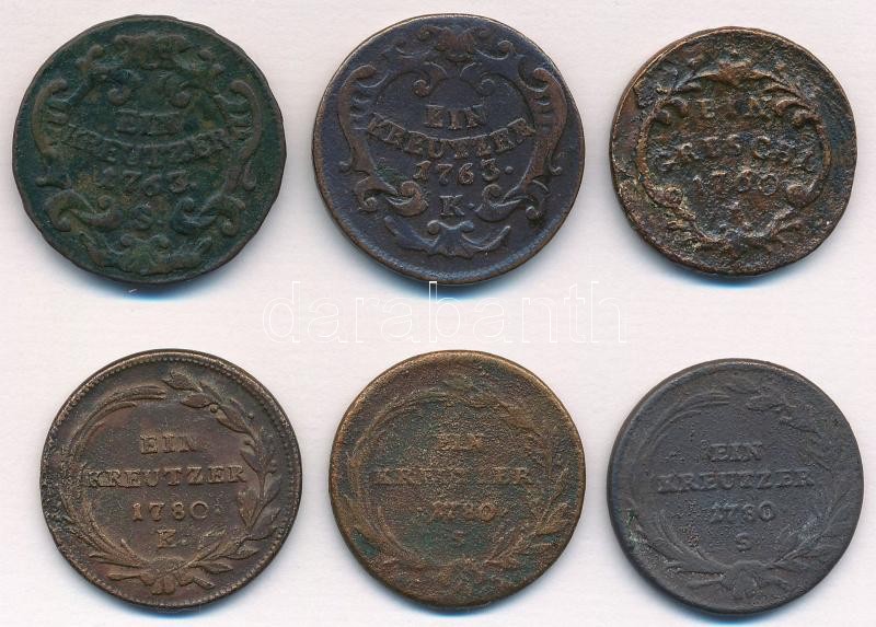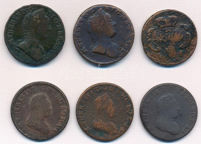 Leírás: 1760-1780. 6db-os vegyes rézpénz tétel, közte szép tartású 1763S 1kr Cu "Mária Terézia" T:2-3