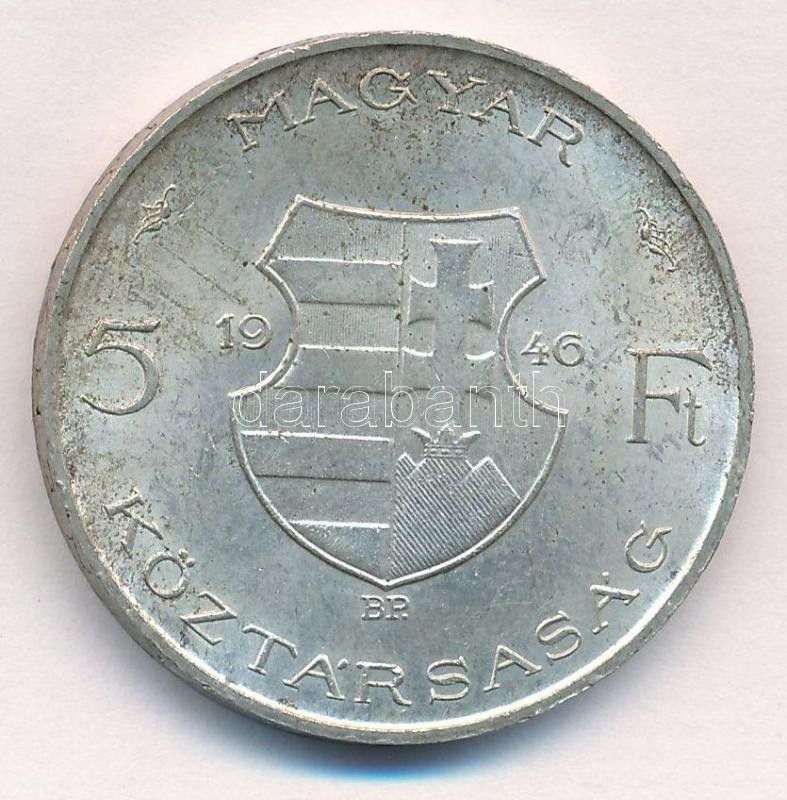 Leírás: 1946. 5Ft Ag "vastag Kossuth" fordított peremirattal T:1- kis patina