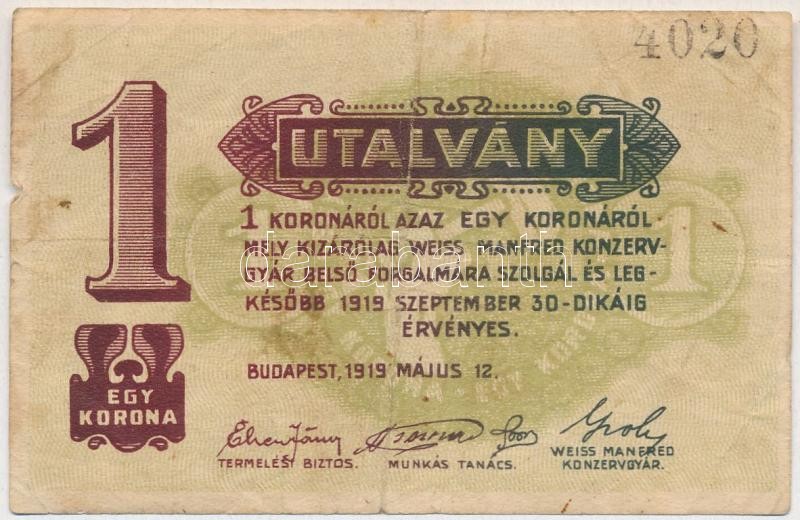 Leírás: Budapest 1919. 1K "Weiss Manfred Konzervgyár" utalvány T:III