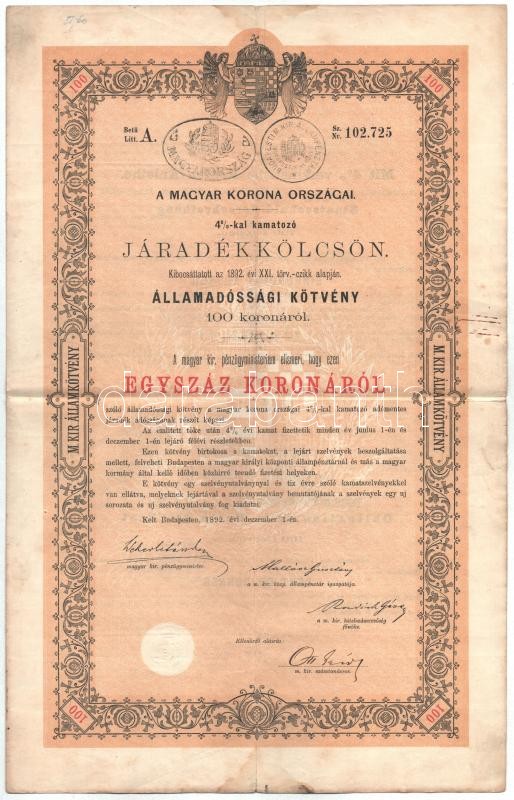 Budapest 1892. "A Magyar Korona országai 4%-al kamatozó járadékkölcsön" államadóssági kötvény 1000K-ról, szárazpecséttel, bélyegzéssel, szelvényekkel T:III fo.