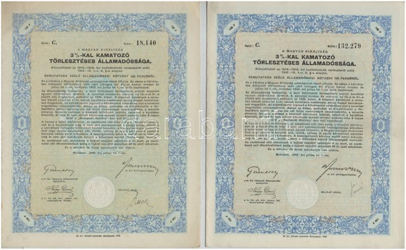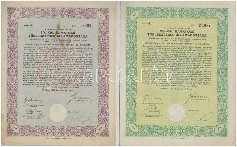 Budapest 1942. "A Magyar Királyság 3%-kal Kamatozó Törlesztéses Államadóssága" kötvénye 25P-ről szárazpecséttel és szelvényekkel + Budapest 1942. "A Magyar Királyság 3%-kal Kamatozó Törlesztéses Államadóssága" kötvénye 50P-ről szárazpecséttel és szelvényekkel + Budapest 1942. "A Magyar Királyság 3%-kal Kamatozó Törlesztéses Államadóssága" kötvénye 100P-ről szárazpecséttel és szelvényekkel (2x) T:III foltos
