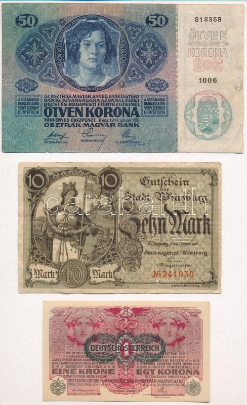 Leírás: 1914. 50K + 1916. 1K + Német Birodalom/Würzburg 1918. 10M + Orosz Birodalom 1912-1917. (1912) 500R Szign.:Shipov T:I--III- foltos