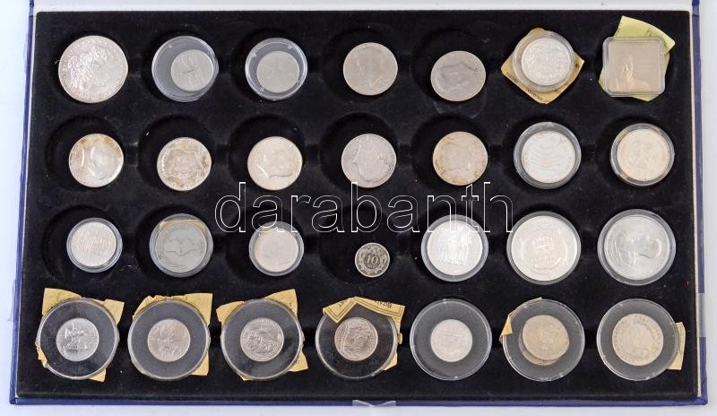 28db-os vegyes magyar és külföldi érme tétel "Egyesült Európa" éremtartó tálcán, közte 16db ezüst, Amerikai Egyesült Államok 1964. 1/2$ Ag "Kennedy"; Ausztria 1808A 20kr Ag "I. Ferenc"; 1997. 750Ft Ag "Labdarúgó VB" T:PP,1-,2 patina, tálca sérült és ragasztott