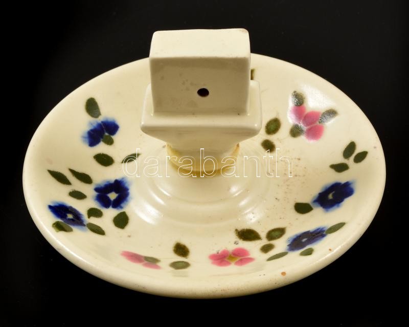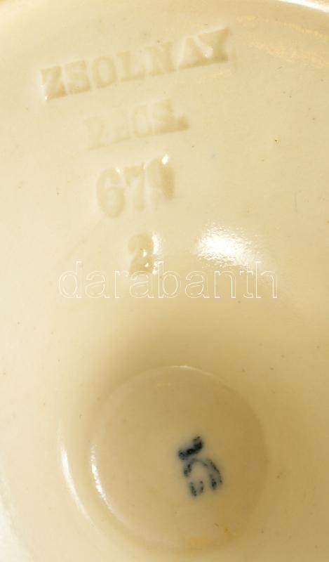 cca 1890 Zsolnay gyufadoboztartós hamuzó, kézzel festett porcelánfajansz, jelzett (csak mélynyomás), formaszám: 679, máz hibákkal, d: 12,5 cm, m:8,5 cm