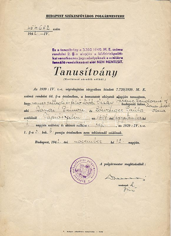 1942 Származási tanusítvány https://www.darabanth.com/hu/36-Gyorsarveres/36.0/Festmeny-mutargy-papirregiseg-egyeb/Judaika~70/1942-Szarmazasi-tanusitvany~II71681