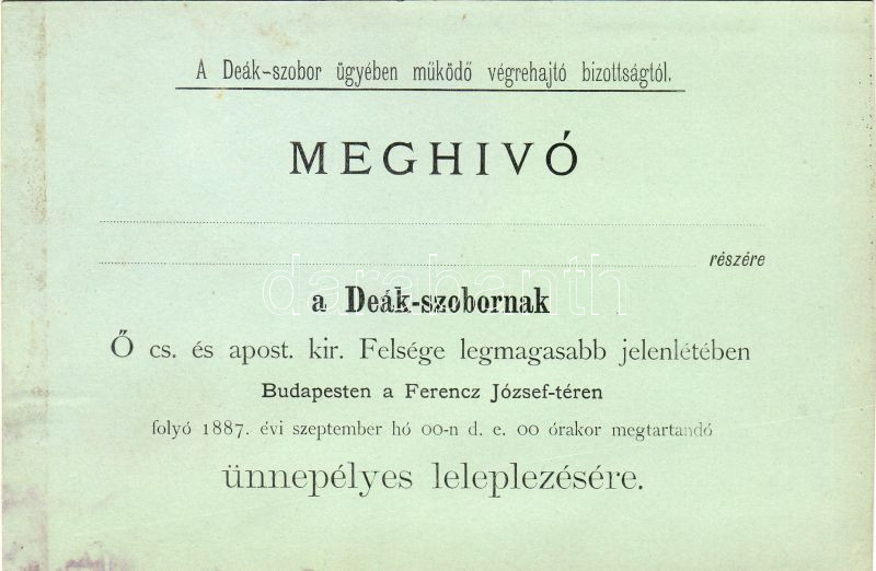1887 Meghívó a Deák-szobor leleplezésére https://www.darabanth.com/hu/36-Gyorsarveres/36.0/Festmeny-mutargy-papirregiseg-egyeb/Nyomtatvany~71/1887-Meghivo-a-Deak-szobor-leleplezesere~II71073