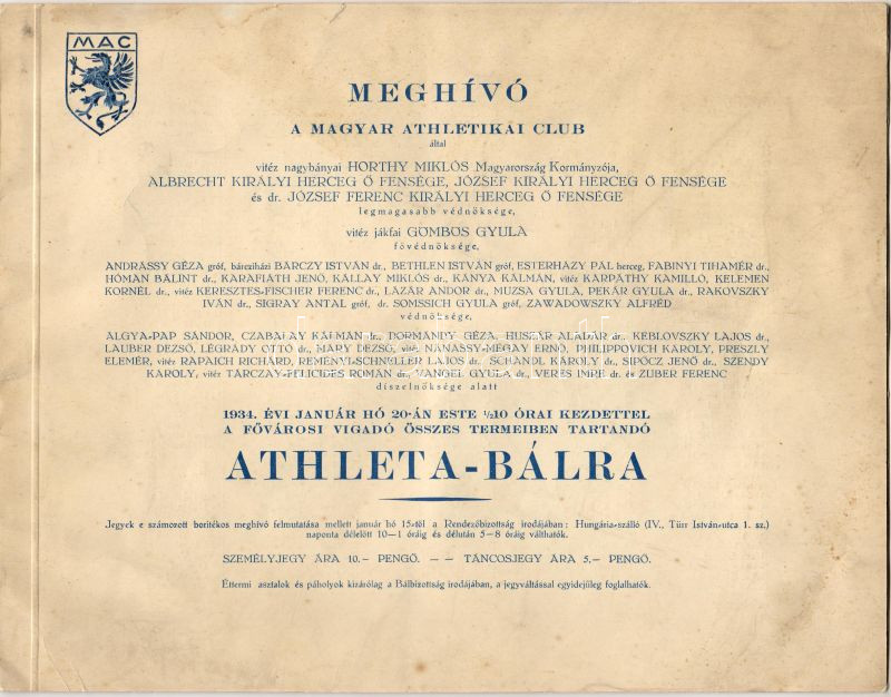 1934 Meghívó a Magyar Athlétikai Club Athléta-báljára https://www.darabanth.com/hu/36-Gyorsarveres/36.0/Festmeny-mutargy-papirregiseg-egyeb/Nyomtatvany~71/1934-Meghivo-a-Magyar-Athletikai-Club-Athleta-baljara~II70354