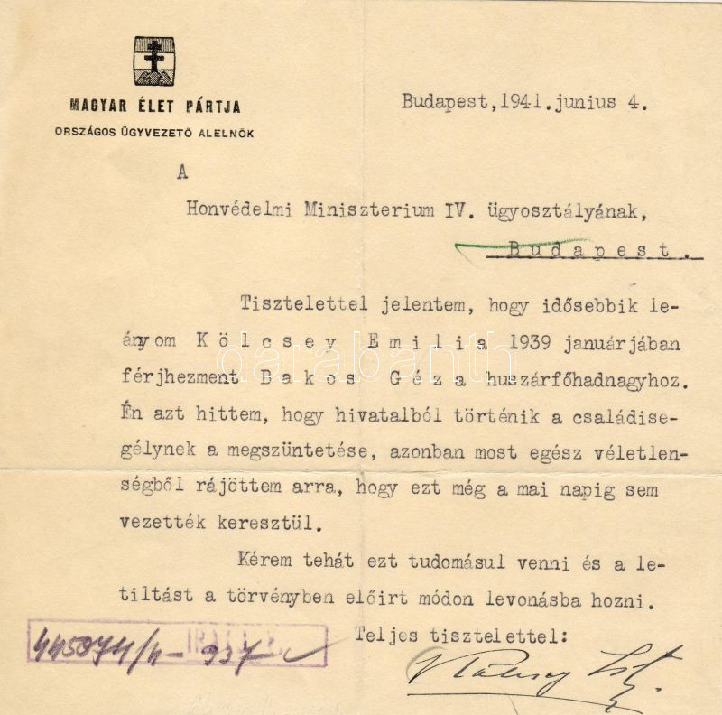 1941 Levél a Magyar Élet Pártja számára https://www.darabanth.com/hu/36-Gyorsarveres/36.0/Festmeny-mutargy-papirregiseg-egyeb/Nyomtatvany~71/1941-Level-a-Magyar-Elet-Partja-szamara~II71075