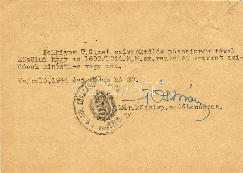 Leírás: 1944 levelezőlap felszólítás zsidó származás igazolására