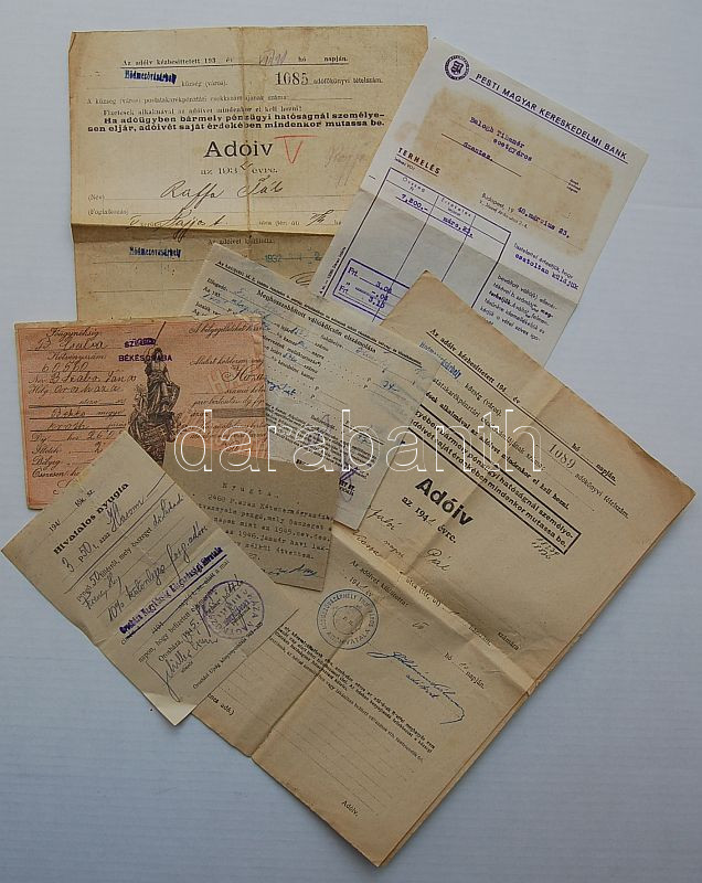 Leírás: 7 db hivatalos nyugta, díjkötelezvény, egyéb irat