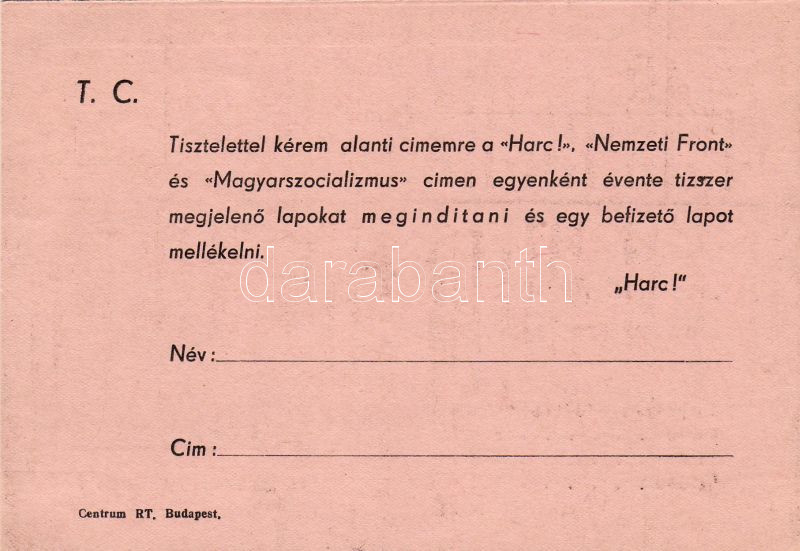 Előfizetési igénylés nemzetiszocialista lapokra levelezőlapon https://www.darabanth.com/hu/36-Gyorsarveres/36.0/Festmeny-mutargy-papirregiseg-egyeb/Nyomtatvany~71/Elofizetesi-igenyles-nemzetiszocialista-lapokra-levelezolapon~II71072