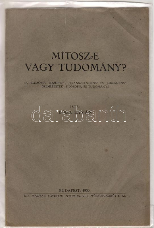 Leírás: Mítosz-e vagy tudomány (A filozófia kezdete transzcendens és immaneus elméletek, Bp. 1930)