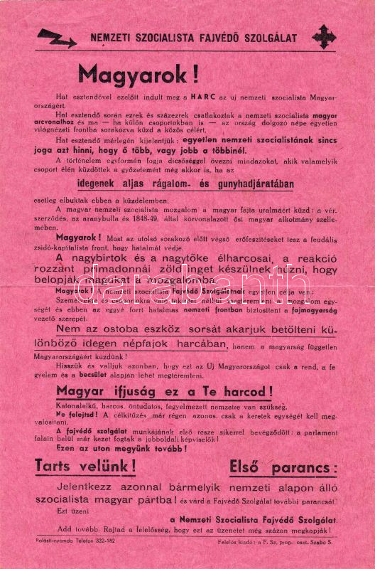 Nemzeti Szocialista Fajvédő Szolgálat röplapja https://www.darabanth.com/hu/36-Gyorsarveres/36.0/Festmeny-mutargy-papirregiseg-egyeb/Nyomtatvany~71/Nemzeti-Szocialista-Fajvedo-Szolgalat-roplapja~II71066