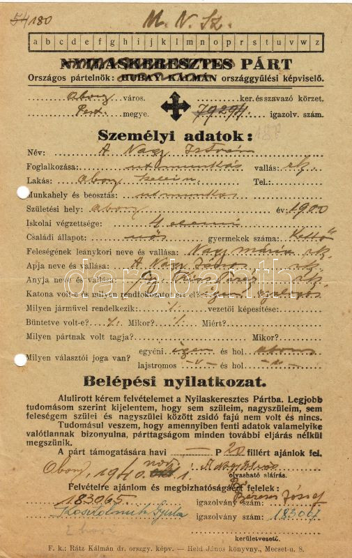 Leírás: 1940 Magyar Nemzetizocialista Párt belépési nyilatkozata