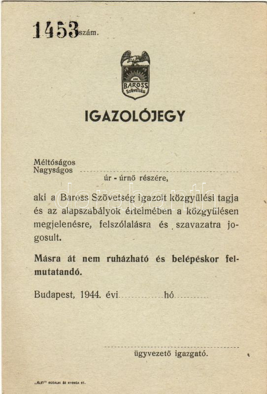 1944 Baross szövetség igazolójegye + 2 db kitűzője https://www.darabanth.com/hu/36-Gyorsarveres/36.0/Festmeny-mutargy-papirregiseg-egyeb/Okmanyok~69/1944-Baross-szovetseg-igazolojegye-plus-2-db-kituzoje~II71040