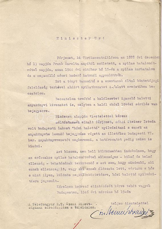 Leírás: 1946 Hősi halottá nyilvánításra vonatkozó kérelem igazoló levéllel
