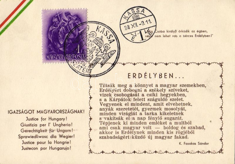 Leírás: Irredenta verses lap "Kassa viszzatért" alkalmi bélyegzéssel