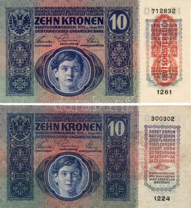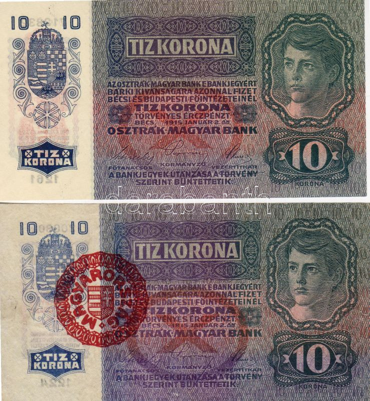 1915. 10Kr (2x) magyar (T:II), ill. osztrák (T:I) fny-sal https://www.darabanth.com/hu/36-Gyorsarveres/36.0/Numizmatika/Magyar-es-kulfoldi-bankjegyek~73/1915-10Kr-2x-magyar-TII-ill-osztrak-TI-fny-sal~II71774