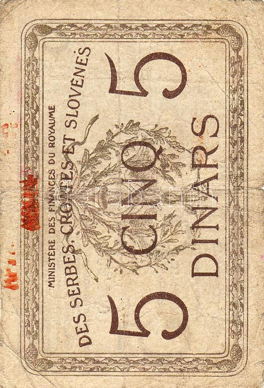 Jugoszlávia 1919. 5D piros fny. T:III/IV https://www.darabanth.com/hu/36-Gyorsarveres/36.0/Numizmatika/Magyar-es-kulfoldi-bankjegyek~73/Jugoszlavia-1919-5D-piros-fny-TIIIIV~II71795