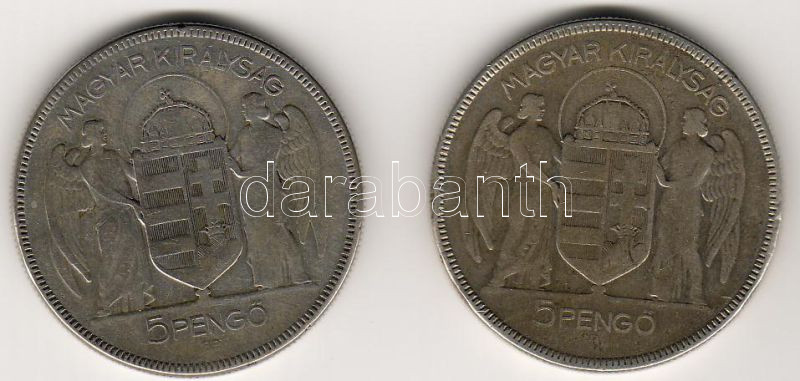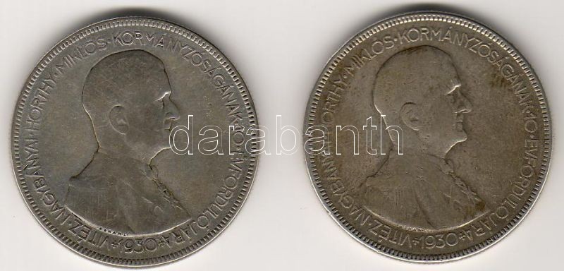 1930. "Horthy" 5P (2x) ezüst T:3/4 ph. https://www.darabanth.com/hu/36-Gyorsarveres/36.0/Numizmatika/Magyar-es-magyar-verdejelu-fem-es-ezust-penzek~110/1930-Horthy-5P-2x-ezust-T34-ph~II71810