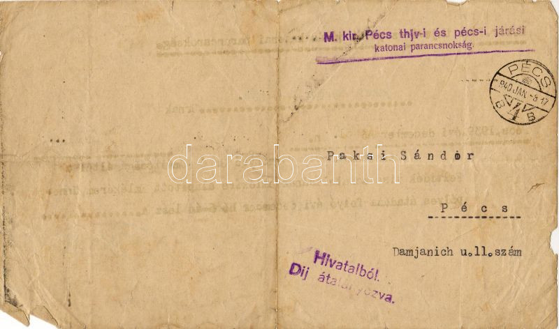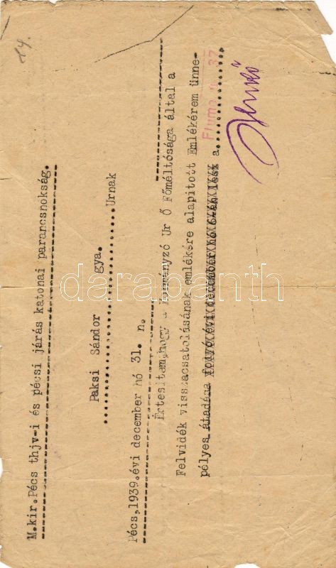 Leírás: 1939. "Felvidék visszacsatolása" emlékérem átadási kiértesítője személyre szólóan