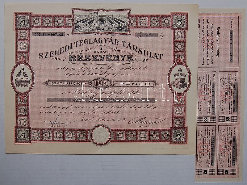 1926. Szegedi Téglagyár Társulat részvénye 125P-ről https://www.darabanth.com/hu/36-Gyorsarveres/36.0/Numizmatika/Reszvenyek-ertekpapirok~83/1926-Szegedi-Teglagyar-Tarsulat-reszvenye-125P-rol~II71785