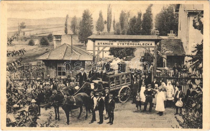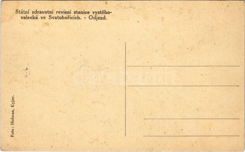 Svatoborice, Státní zdravotni revizní stanice vystehovalecká ve Svatoboricích, Odjezd / departing from the State Health Inspection Station (Sanatorium), horse chariot / Állami egészségügyi ellenőrző állomás a kivándorlók számára Svatoborice-ban