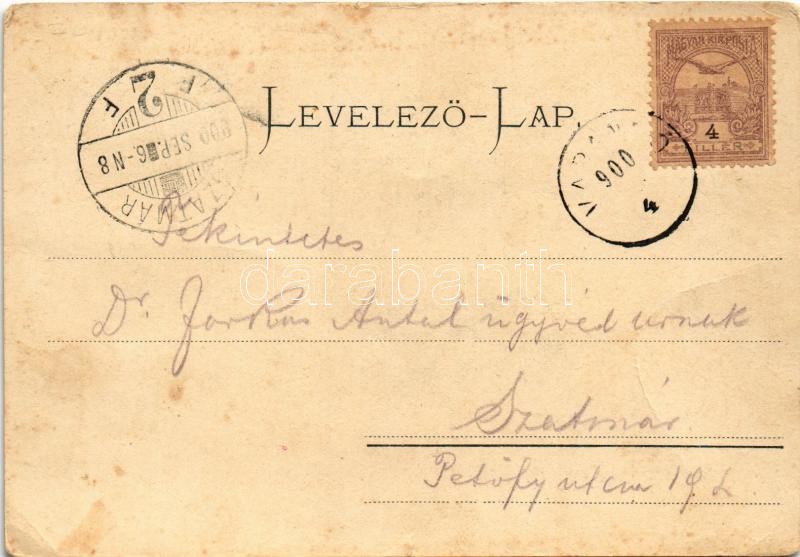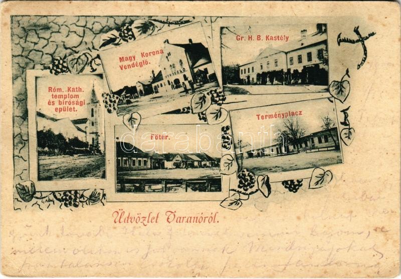 1900 Varannó, Vranov nad Toplou; Gróf Hadik-Barkóczy kastély, Magyar Korona vendéglő, Fő tér, Termény piac, Római katolikus templom, bírósági épületek / church, court, restaurant, main square, castle. Art Nouveau, floral (kis szakadás / small tear)