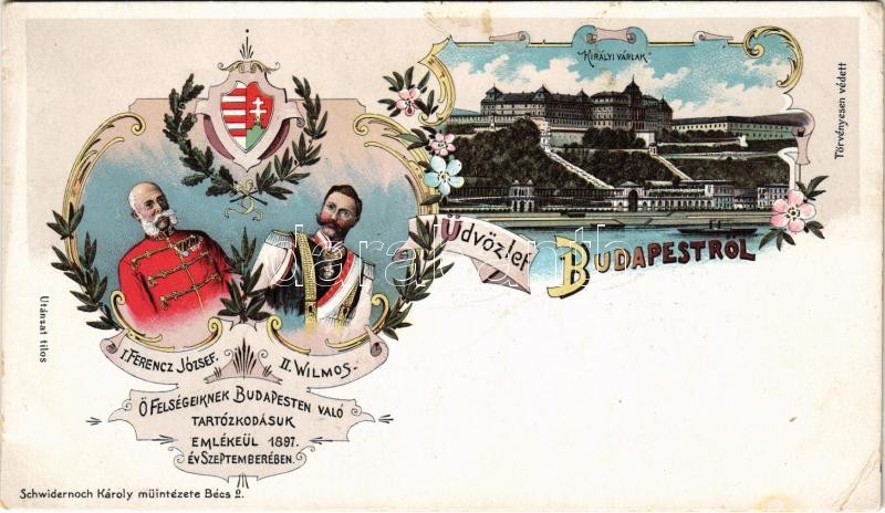 1897 (Vorläufer) Budapest, I. Ferencz József és II. Vilmos őfelségeiknek Budapesten való tartózkodásuk emlékéül szeptemben, Királyi várlak. Schwidernoch Károly Art Nouveau, floral, litho (EK)