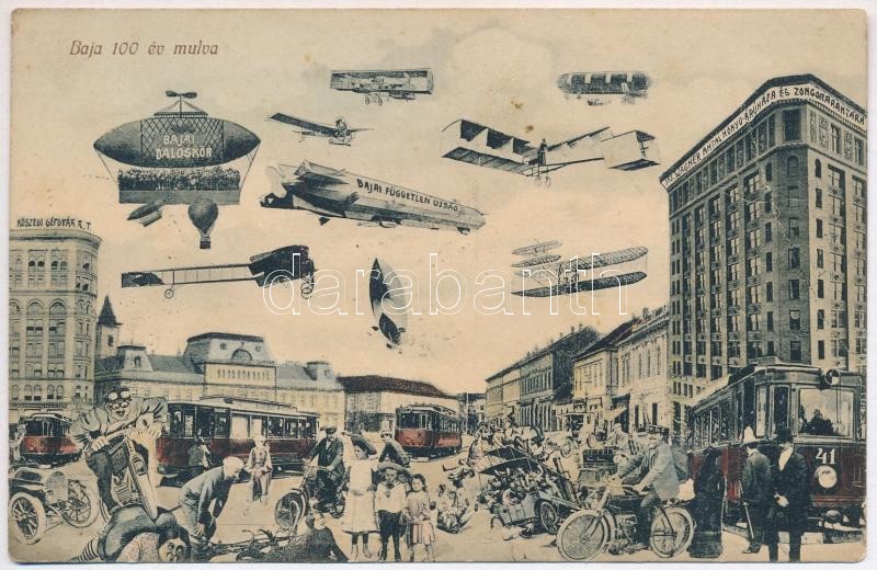 1909 Baja, 100 év múlva. A jövőben montázs, Ifj. Wagner Antal kiadása ... https://www.darabanth.com/hu/36-Nagyaukcio/36.1/Kepeslapok/Magyarorszag~15417/1909-Baja-100-ev-mulva-A-jovoben-montazs-Ifj-Wagner-Antal-kiadasa-EB~II2490788