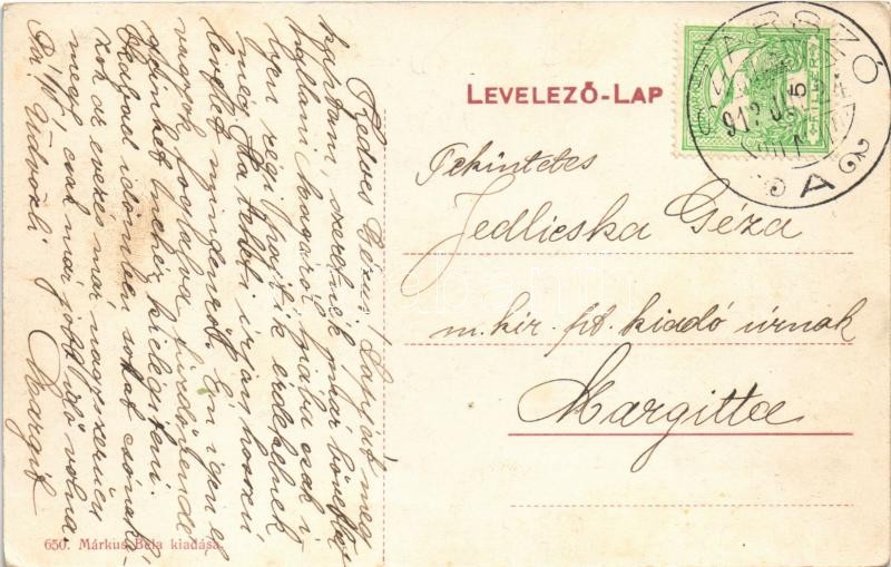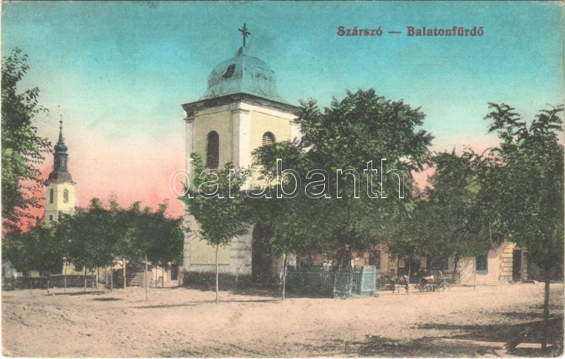 Leírás: 1912 Balatonszárszó, Szárszó-Balatonfürdő; harangtorony, tér, templom. Márkus Béla kiadása