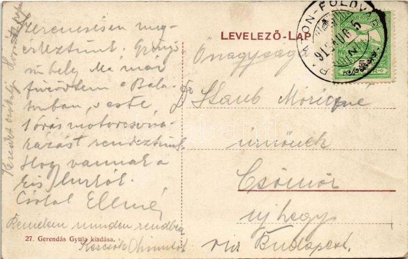 Leírás: 1913 Balatonföldvár, vasútállomás, gőzmozdony, vonat. Gerendás Gyula kiadása