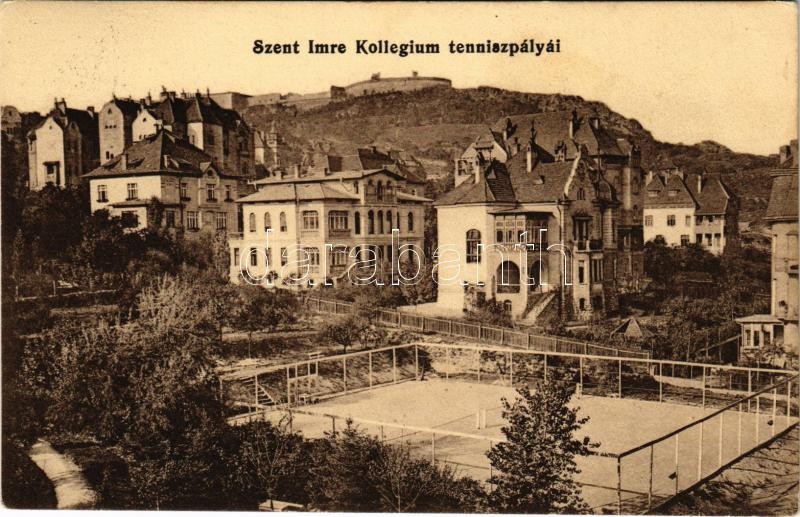Leírás: 1918 Budapest XI. Budai Szent Imre Kollégium a Fehérvári úton (ma Bartók Béla út 17-19.), a kollégium teniszpályái, sport
