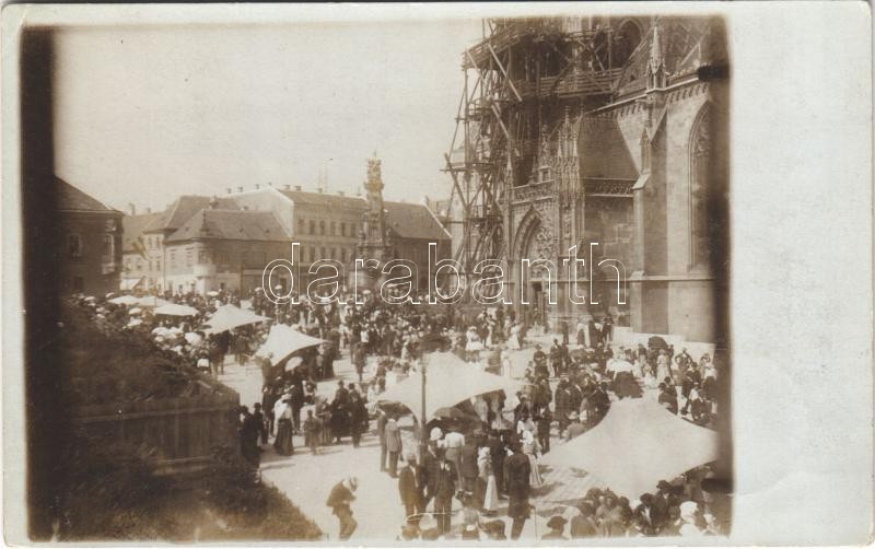 Leírás: 1935 Budapest I. Koronázó Mátyás templom átépítés közben felállványozva, Szentháromság szobor, piac. photo (EK)