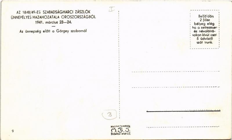 1941 Budapest I. Az 1848-49-es szabadságharci zászlók ünnepélyes hazah... https://www.darabanth.com/hu/36-Nagyaukcio/36.1/Kepeslapok/Magyarorszag~15417/1941-Budapest-I-Az-1848-49-es-szabadsagharci-zaszlok-unnepelyes-hazahozatala-Oroszorszagbol~II2481678