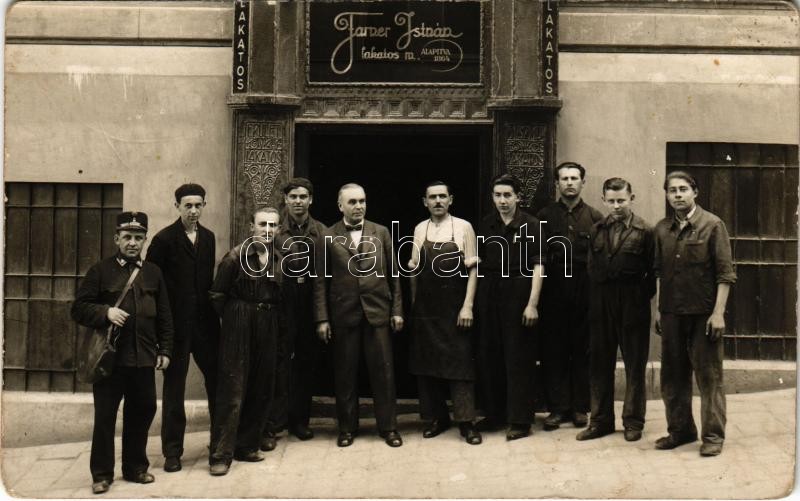 1941 Budapest I. Farner István lakatos műhelye lakatosokkal, segédekkel és postással (Batthyány utca 31.). Korok Györgyné Szappanos Júlia fényképész, photo (EK)