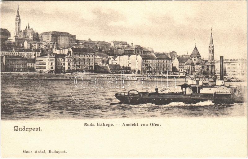Leírás: Budapest I. Budai part, Szilágyi Dezső téri református templom, "SALZACH" gőzüzemű oldalkerekes vontatóhajó. Ganz Antal
