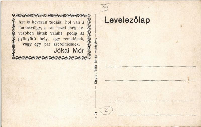 Budapest XII. Farkasrét, Szerelem bolondjai vendéglő kertje, Kármentő. Jókai Mór idézet a hátoldalon (Torbágyi út 37. ma Rácz Aladár és Kázmér út kereszteződése)