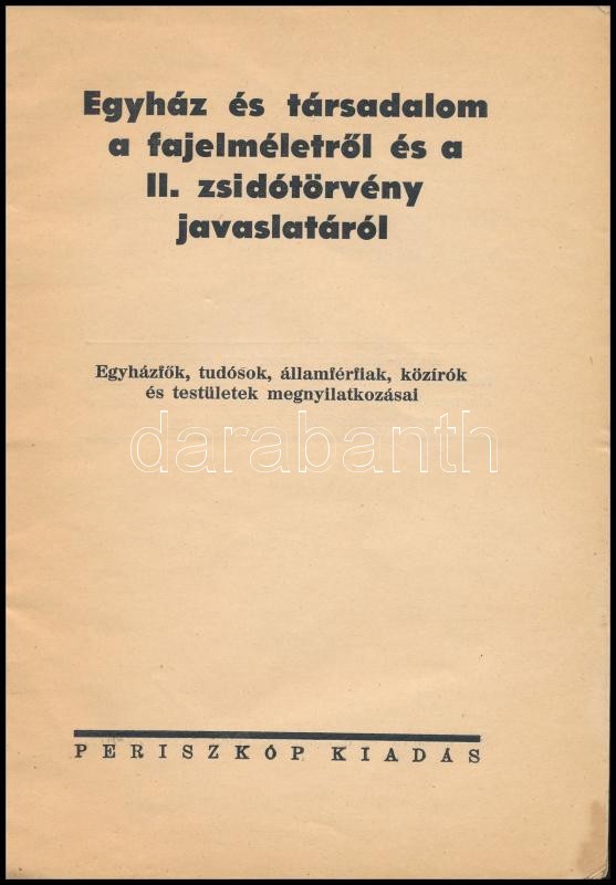 Egyház és társadalom a fajelméletről és a II. zsidótörvény javaslatáról. Egyházfők, tudósok, államférfiak, közírók, és testületek megnyilatkozásai. Szerk.: Sós Endre. Periszkóp kiadás. Bp., 1939., Klein V.-ny., 82+2 p. Kiadói papírkötés, a hátsó borítón kis szakadással, kis folttal, kissé laza kötéssel.