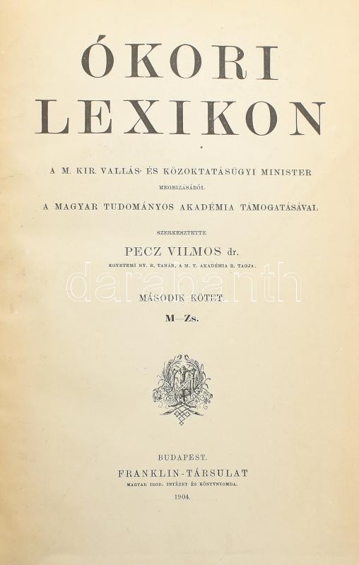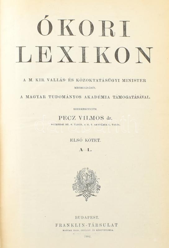 Ókori lexikon. Szerk.: Pecz Vilmos. 1-2. köt. Bp., 1902-1904, Franklin... https://www.darabanth.com/hu/36-Nagyaukcio/36.1/Konyvek/Konyvek-Tortenelem~15116/Okori-lexikon-Szerk-Pecz-Vilmos-1-2-kot-Bp-1902-1904-Franklin-Aranyozott-gerincu-egesz~II2444913