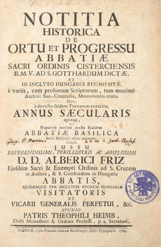 Notitia historica de ortu et progressu Abbatiae Sacri Ordinis Cisterciensis B. M. V. ad S. Gothardum dictae et in inclyto Hungaria sitae :? variis, cum proborum Scriptorum, tum maxim? Archivi San-Crucensis, Monumentis eruta ; dum, ? devicto ibidem Turcarum exercitu, Annus saecularis...