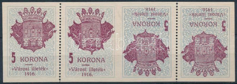 Leírás: 1916 Székesfehérvár 5K (IV/5a) középen fogazatlan fordított pár, teljes csík / fiscal stamp stripe of 4