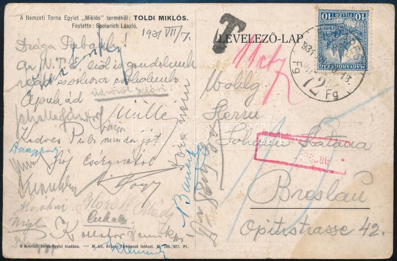 1931 A Nemzeti Torna Egylet tagjai által küldött képeslap, Budapestről Breslau (Wrocław/Boroszló) a képeslap egyik alsó sarkán törésnyommal, kopásnyomokkal, 9,5x14,5 cm
