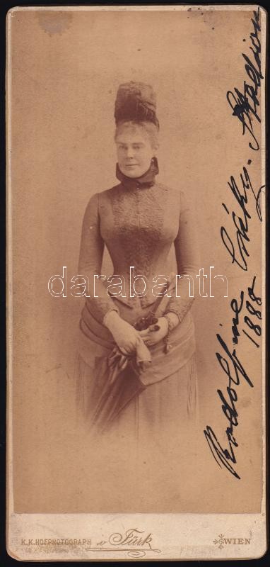 1888 Bécs, gróf Csáky Jenőné, szül. Rudolfine Stadion-Warthausen-Thannhausen (1851-1936) portréja, feliratozott, keményhátú műtermi fotó, K. K. Hofphotograph Othmar von Türk Wien, kisebb foltokkal, 20,5x9,5 cm