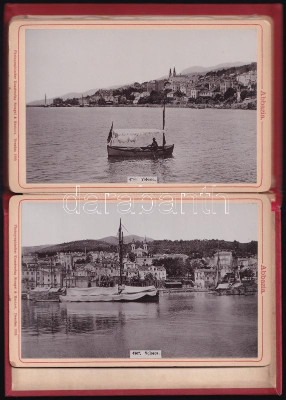 1895 Abbazia, leporelló album 12 fotóval, díszes, aranyozott egészvászon-kötésben kissé sérült, foltos gerinccel, Photograpischer Kunstverlag Stenge & Markert Dresden / Opatija, leporello with 12 photos, in decorative, slightly damaged linen binding, 17,5x11,5 cm