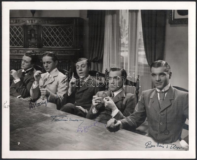 1941 A Gyurkovics-fiuk, werkfotó, rajta: Gyurkovics Gyurka (Benkő Gyula (1918-1997), Gyurkovics Géza (Szilassy László (1908-1972), Gyurkovics Milán (Perényi László (1910-1993), Gyurkovics András (Turáni C. Endre (1908-1980)) Gyurkovics Sándorka (Puskás Tibor (1920-)), rajta a színészek saját kezű aláírásaival