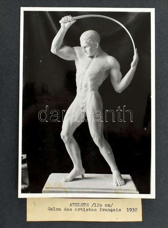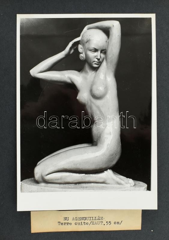 Liszkai Kováts Zoltán (1898-1967) szobrászművész műtermét és műveit bemutató fotóalbum, kb. 100 db fotóval és fotólappal, nyomtatott feliratokkal, néhány fotó hátán jegyzetekkel, egy gépelt jegyzetlappal, egy fotó hátán Liszkai Kováts Zoltán aláírásával, haránt alakú fűzött fotóalbumban, kopott borítóval, egy-két fotón sérüléssel, a fotók egy jelentős része levált az albumlapokról, különféle méretben, változó állapotban.