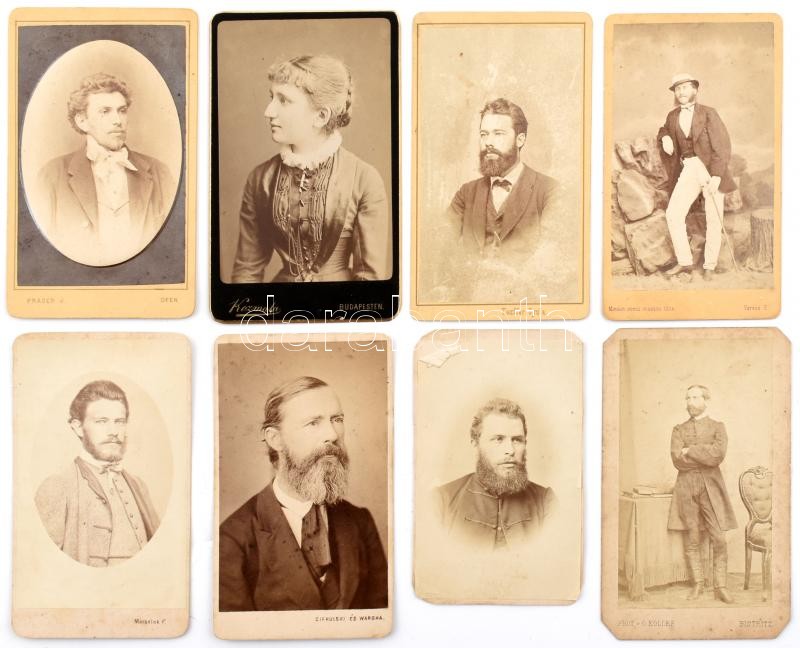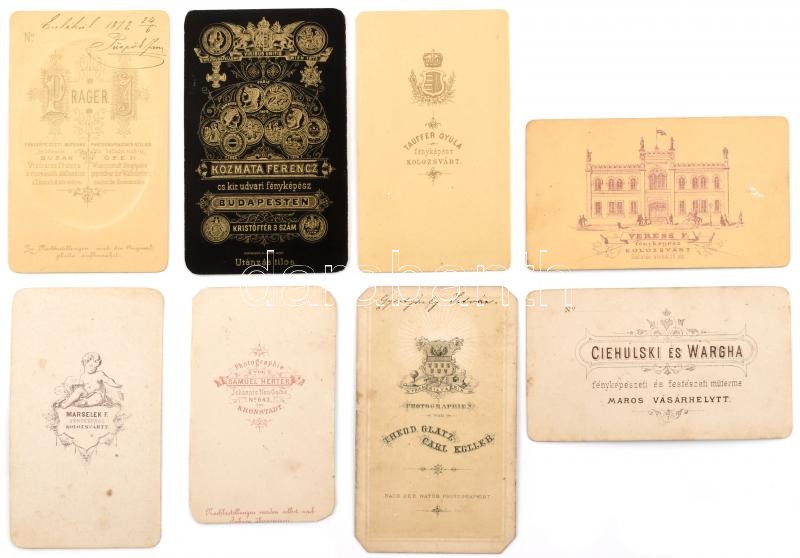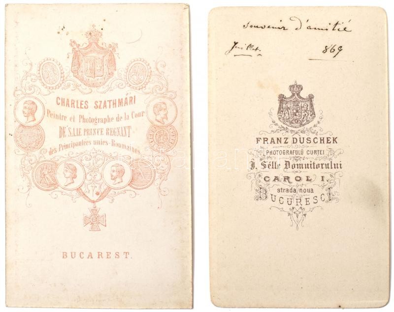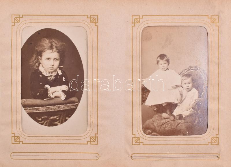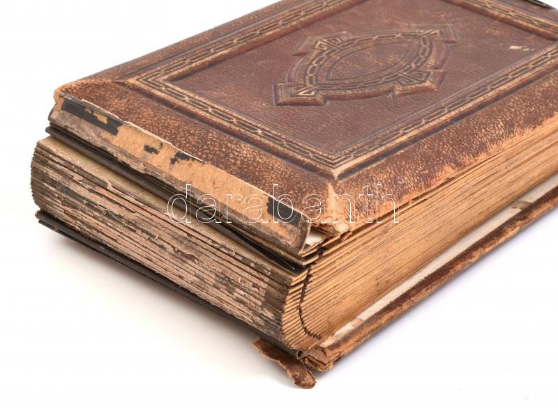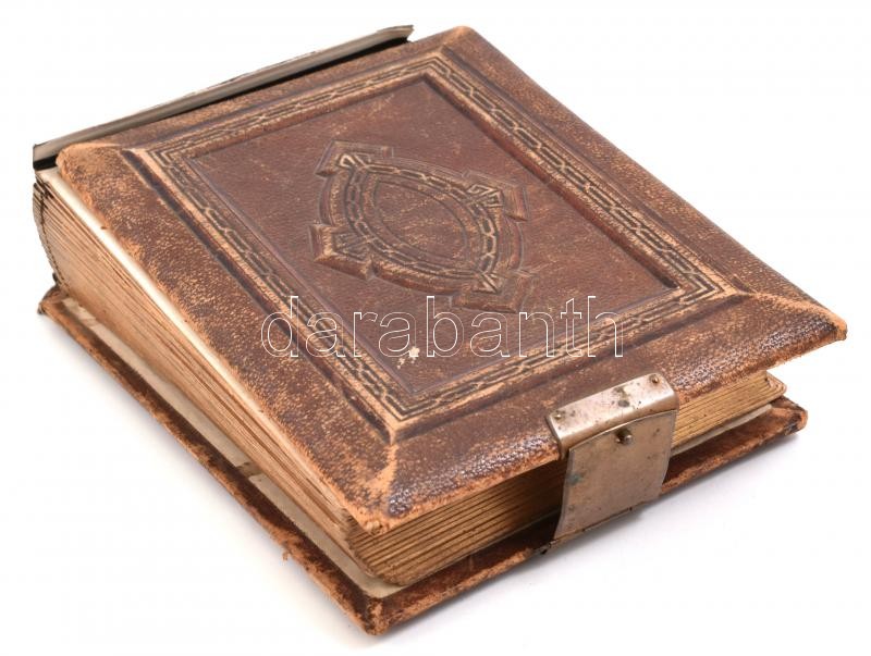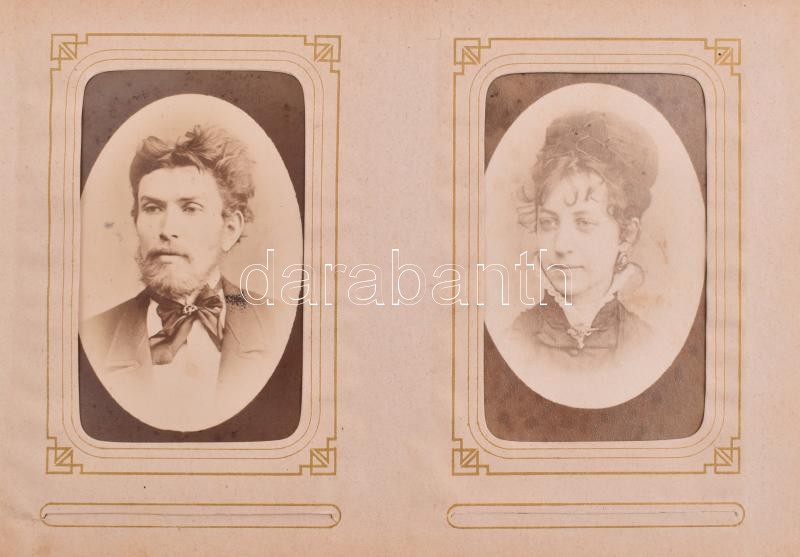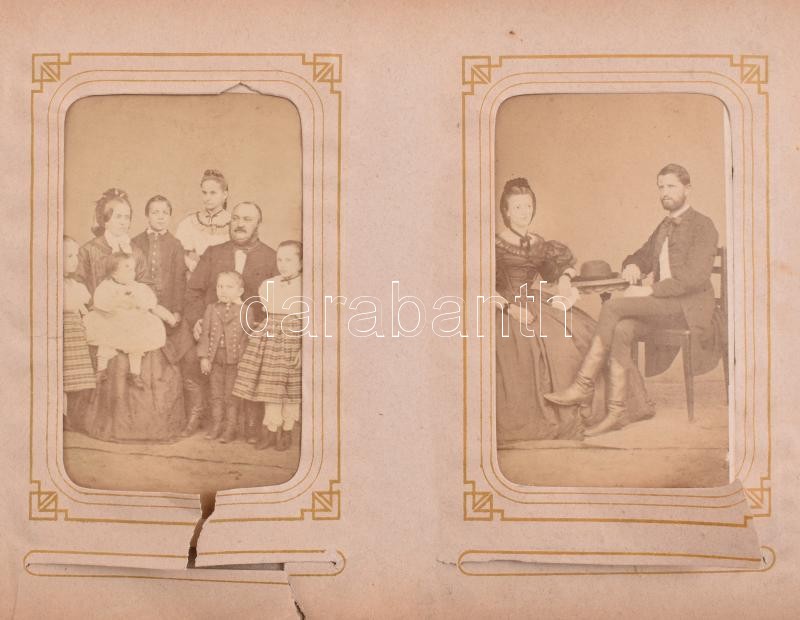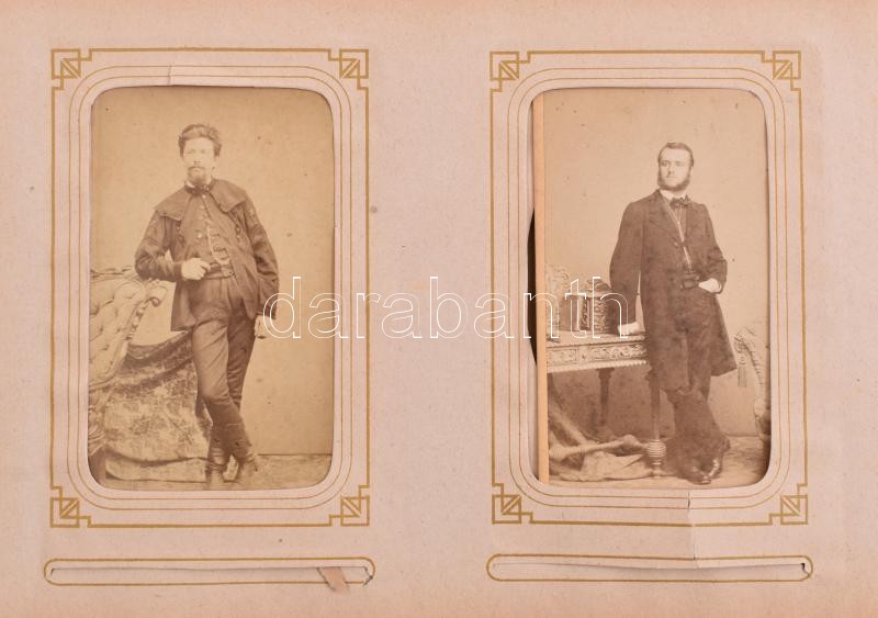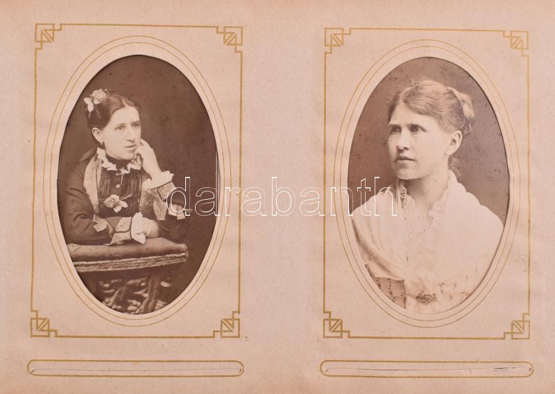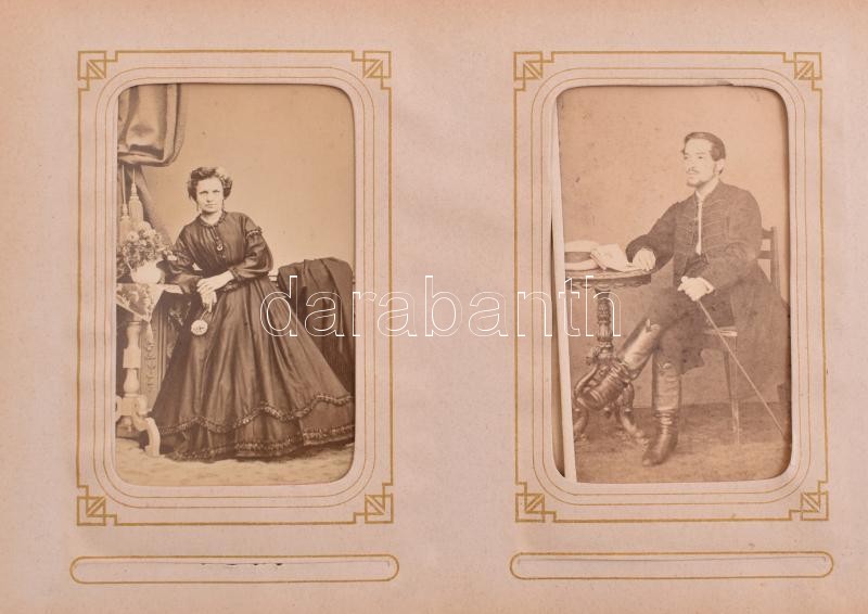 cca 1860-1890 Nemesi család fotóalbuma, feltehetőleg erdélyi vagy erdélyi kötődésű család hagyatékából, 70 db fotó portré fotó, rajta azonosításra váró személyekkel, benne kolozsvári Veress Ferenc, Tauffer Gyula, Marselek F, Brassó, Samuel Herter, Marosvásárhely, Ciehulski P., Ciehulsi és Wargha, Arad, Weisz Testvérek, Segesvár, Ludwig Schuller és más erdélyi műtermekből származókkal, de benne egy-két román műtermekből származókkal (Bucuresci, Franz Duschek, Bucarest Charles Szatmári (Szatmári Pap Károly)), de benne budai, pesti, bécsi, nem jelölt műtermek ...stb. munkáival is. Viseltes állapotú bőr fotóalbumban, különféle, de nagyrészt vizitkártya méretű fotókkal.